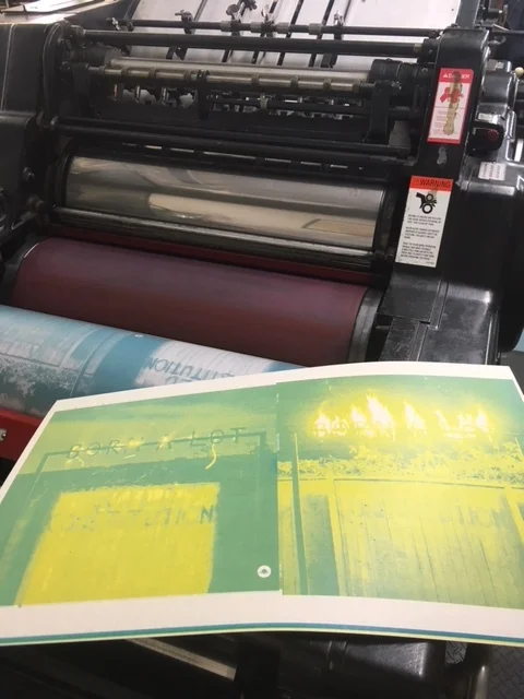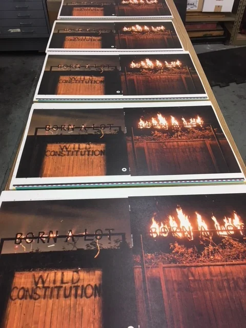 On press, the record jacket for Portland supergroup Born A Lot's forthcoming album. The LP release, “Wild Constitution,” will soon be released on Portland’s Nadine Records. Printed process color, dry trapped one pass at a time. Dry trapping process color printing is a slower process than inline printing. But it’s fun, and provides the benefit of being able to respond to the decrease of optical density after the ink has dried back on prior passes. For this example, we were able to make slight adjustments to the yellow mix to strengthen its presence in the printed image. The texture and finish of the 18 pt. Kraft Duplex stock adds a complimentary level of saturation and dot gain to the image, lending warmth and added dimension to an already striking image. Check soon for Born A Lot’s “Wild Constitution” LP at an independent record store near you!